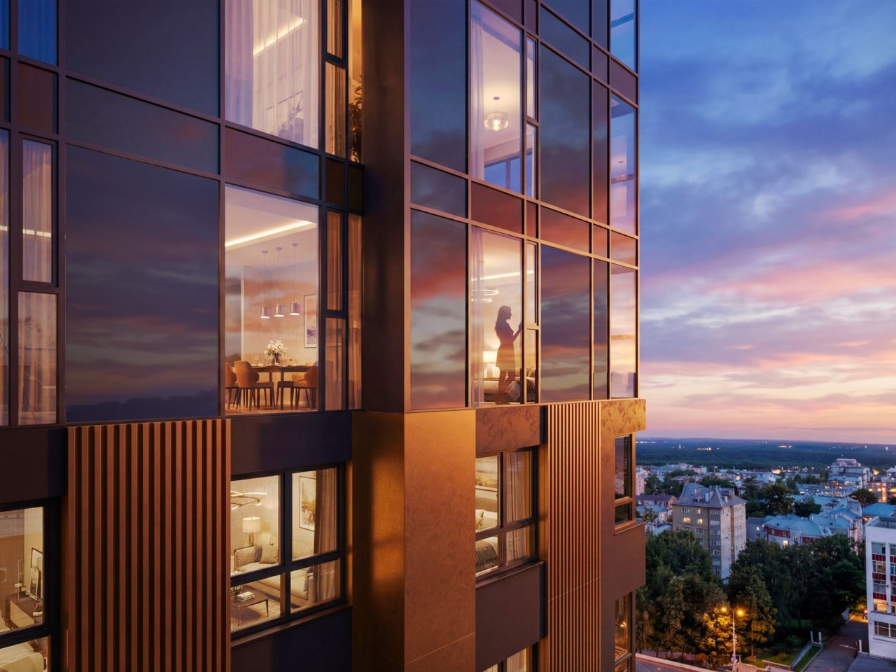 - видовые квартиры на реку с панорамным остеклением в пол с 25 этажа;